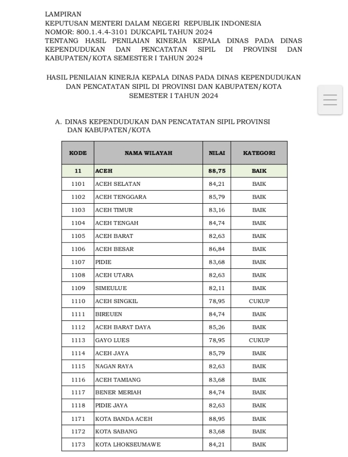 Penilaian tersebut diberikan berdasarkan Keputusan Kementerian Dalam Negeri Republik Indonesia Nomor: 800.1.4.4-3101 Dukcapil Tahun 2024 Tentang Hasil Penilaian Kinerja Kepala Dinas Pada Dinas Kependudukan dan Pencatatan Sipil di Provinsi dan Kabupaten/Kota Semester I Tahun 2024.