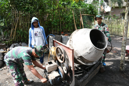 Bondowoso, RADAR-X.net – Keberadaan mesin concrete mixer (pengaduk semen-pasir-split) atau yang sering disebut mesin molen, menjadi andalan utama bagi anggota Satgas TMMD Reguler ke-123 Kodim 0822 Bondowoso di Desa Trotosari, Kecamatan Tlogosari, Kabupaten Bondowoso, Selasa (25/2/2025).