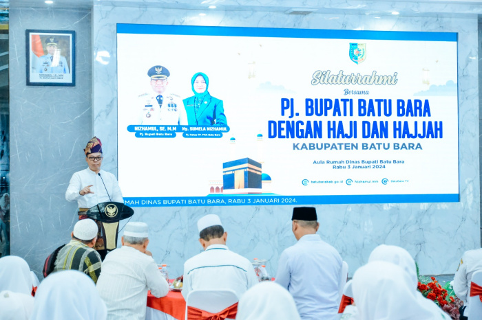 BATU BARA, RADAR-X.net – Untuk mempererat tali silaturahmi, Penjabat (Pj) Bupati Batu Bara Nizhamul, S.E, M.M., menggelar pertemuan dengan para haji dan hajjah Kabupaten Batu Bara tahun 2023 di Aula Rumah Dinas Bupati, Komplek Inalum, Tanjung Gading, Kecamatan Sei Suka, Rabu (03/01/2024).