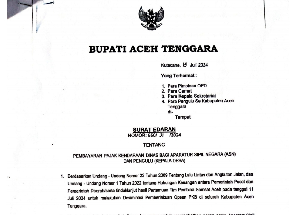 Sesuai dengan salinan surat edaran Pj Bupati Aceh Tenggara nomor: 550/21/2024 yang diterima IndonesiaGlobal, meberitahukan kepada ASN dan Pengulu agar melakukan pembayaran Pajak Kendaraan Bermotor (PKB) yang akan habis masa pajaknya maupun telah habis masa pajaknya untuk Kendaraan Dinas baik Kendaraan Dinas Roda Empat maupun Roda dua di Instansi masing-masing yang Saudara pimpin.