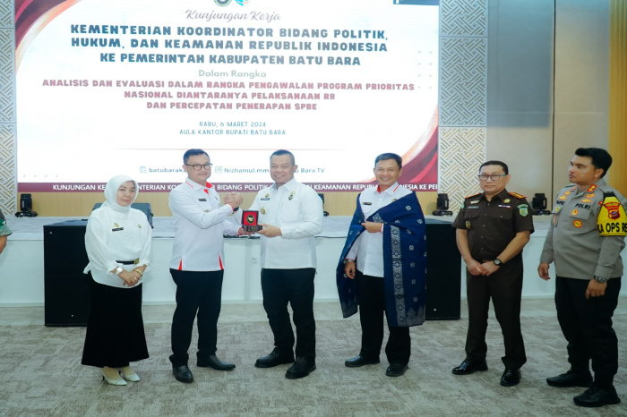 Kedatangan Tim Kemenkopolhukam RI yang di pimpin Asisten Deputi koordinasi Tata Kelola Pemerintahan Y. Saiful Garyadi disambut langsung Pj. Bupati Batu Bara Nizhamul, S.E, M.M beserta Forkopimda, Sekda Norma Deli Siregar dan Kepala OPD Se-Kabupaten Batu Bara di Aula Kantor Bupati, Jalinsum, Kecamatan Lima Puluh, Rabu (06/03/2024).