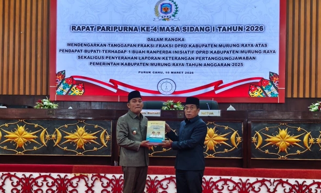 PURUK CAHU, Radar-x.net – Pemerintah Kabupaten Murung Raya menyampaikan Laporan Keterangan Pertanggungjawaban (LKPJ) Bupati Murung Raya Tahun Anggaran 2025 dalam Rapat Paripurna ke-4 Masa Sidang I Tahun 2026 di ruang rapat paripurna DPRD Murung Raya, Selasa (10/3/2026).